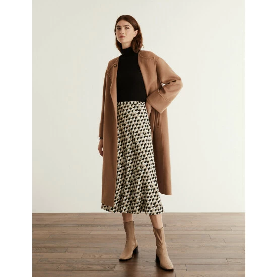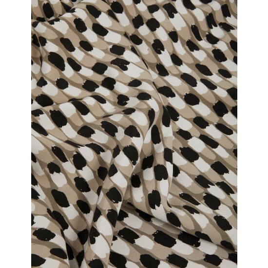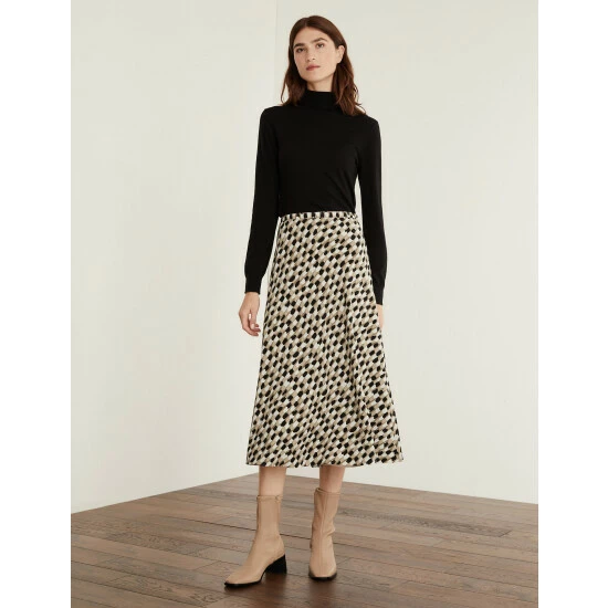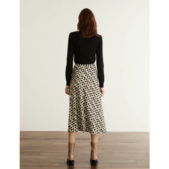 Blending luxurious pure silk fabric with a graphic mark print, this A-line skirt from Jaeger is a modern classic. This style is cut on the bias for a flattering shape and with a zip fastening for your perfect fit. It’s lined for comfort and a smooth, flowing drape. Wear it with a plain t-shirt for an effortless weekend look, or with a crew neck knit for smart-casual workwear.