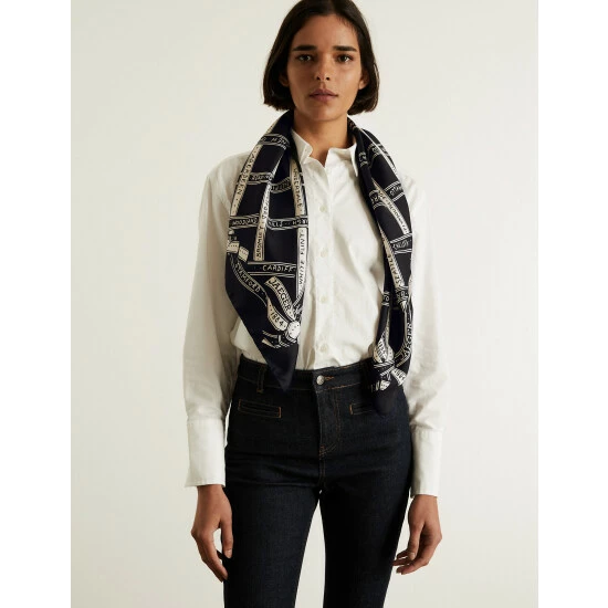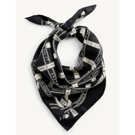 This pure silk Jaeger scarf features a refined monogram print for a unique, vintage-inspired aesthetic. The woven design is luxuriously smooth to the touch, with a subtle lustrous sheen. It comes in a traditional square silhouette, enabling you to style it around your neck, twirled into your hair or tied to a bag.