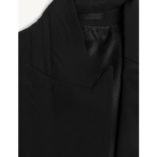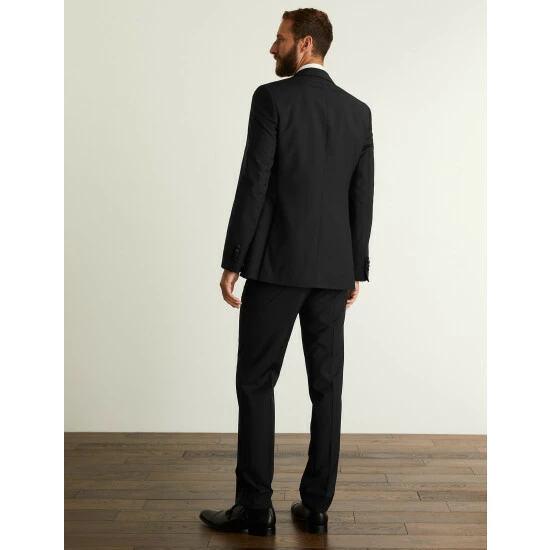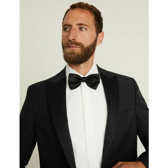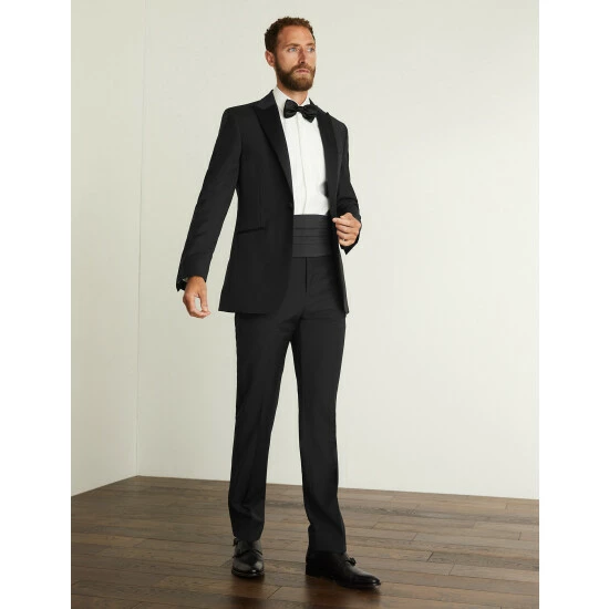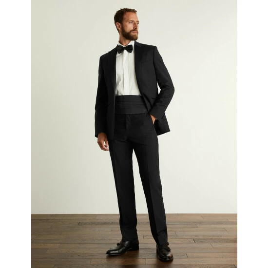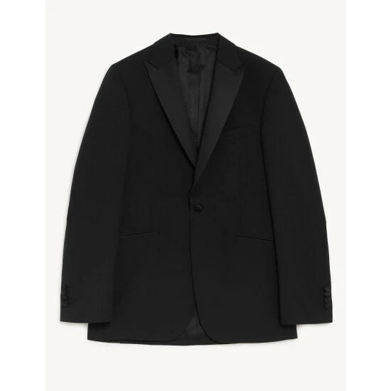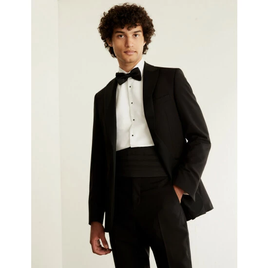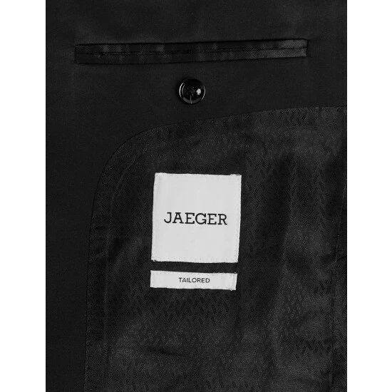 Elevate your evening attire with this wool-rich tuxedo jacket from Jaeger, made with luxurious mohair. This tailored-fit piece is crafted from cloth woven at Italian mill Marzotto, with satin peaked lapels, jetted pockets and smart covered buttons. It’s cut using a half-canvas construction, for a lightweight feel with plenty of movement, allowing this jacket to mould elegantly to the torso. This piece is lined for comfort. Create the perfect event ensemble by pairing with a traditional bib shirt, black bow tie and matching trousers.
