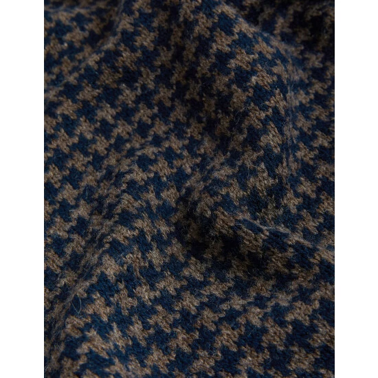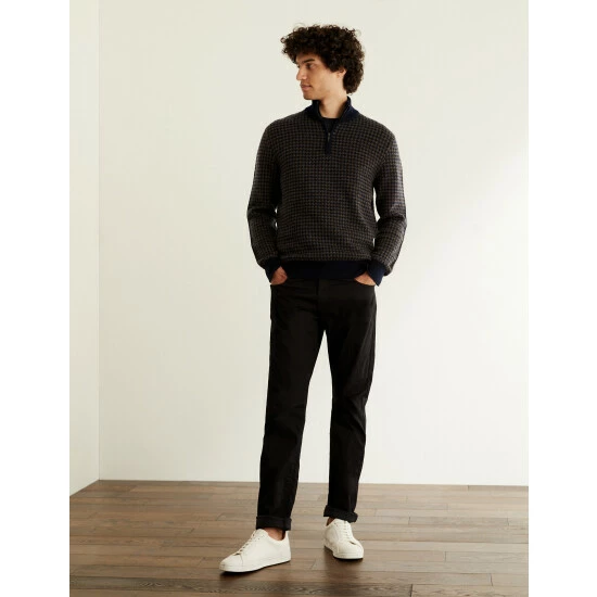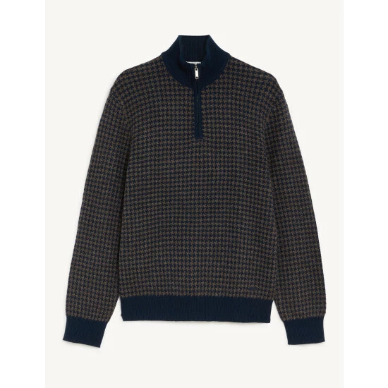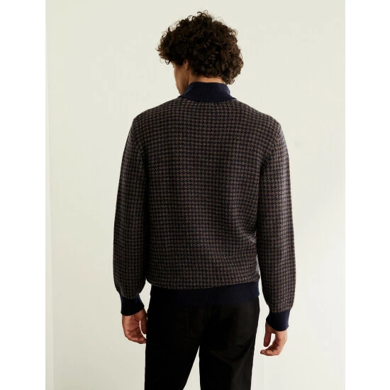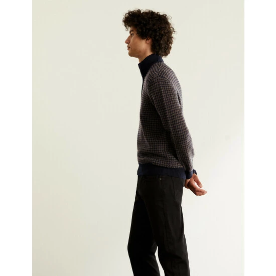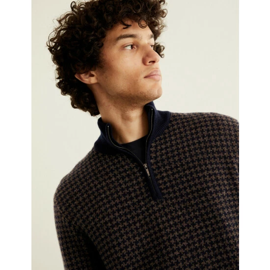 The warmth of wool meets the softness of cashmere with this luxurious jumper by Jaeger. It has a contemporary half-zip design, with a cosy high neck. The houndstooth detailing lends a heritage feel and unique texture to the knit, bringing a hint of pattern to dark trousers and coats.